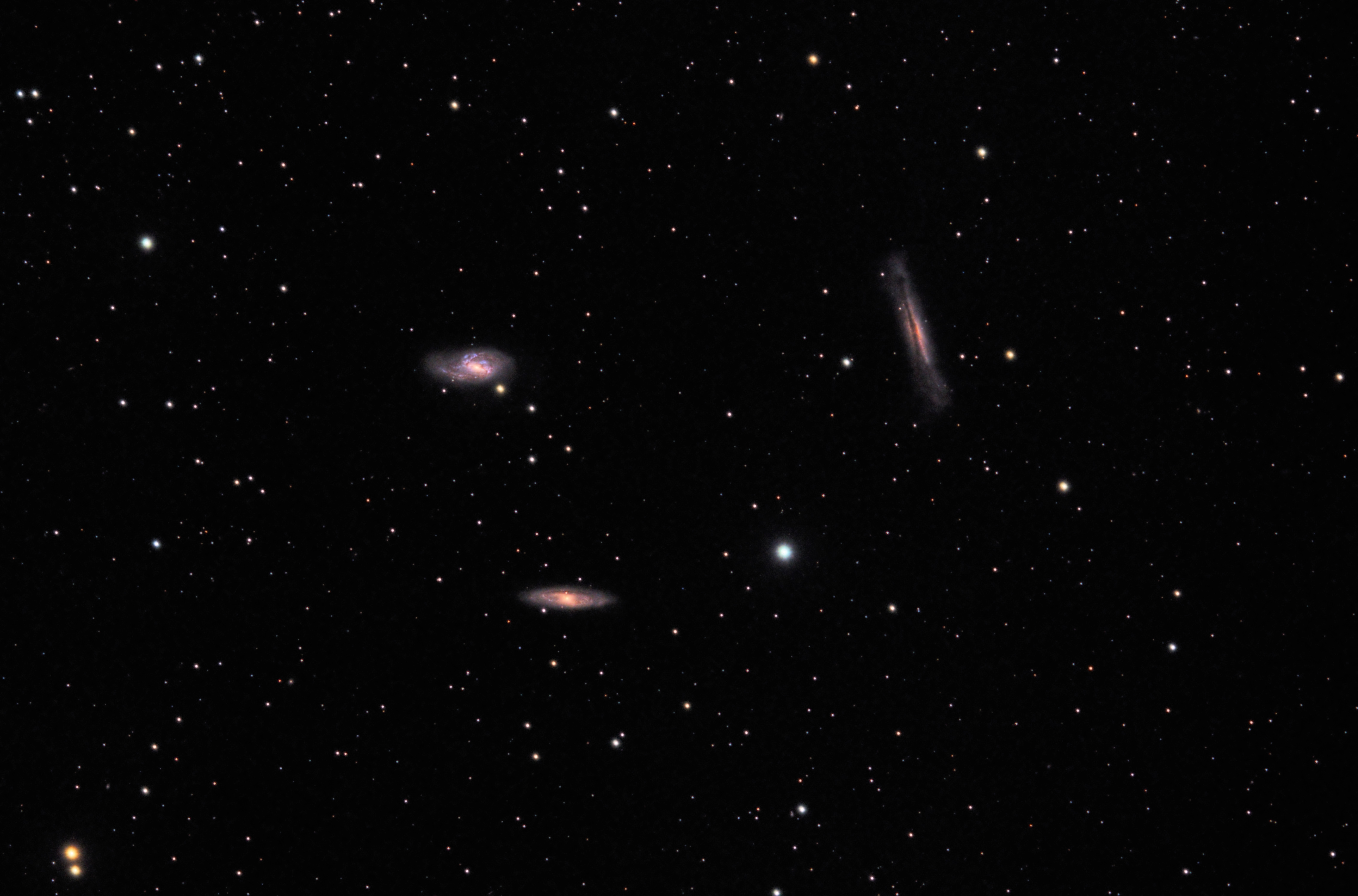 The Leo Triplet, also known as the M66 Group, is a small group of galaxies about 35 million light-years away in the constellation Leo. This galaxy group consists of the spiral galaxies M65, M66, and NGC 3628 (Hamburger Galaxy).